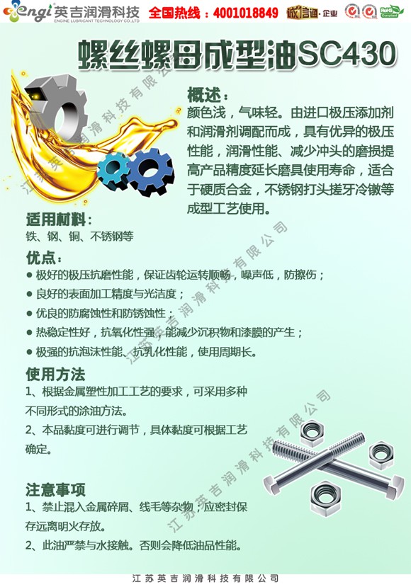 颜色浅,气味轻,螺丝、螺帽成型专用油,适用于搓牙、打头、锻造等冷成型工序。其所 含特殊成份能产生强韧之润滑油膜及特优的冷却效果,可降低模具损耗并提供最佳的加工